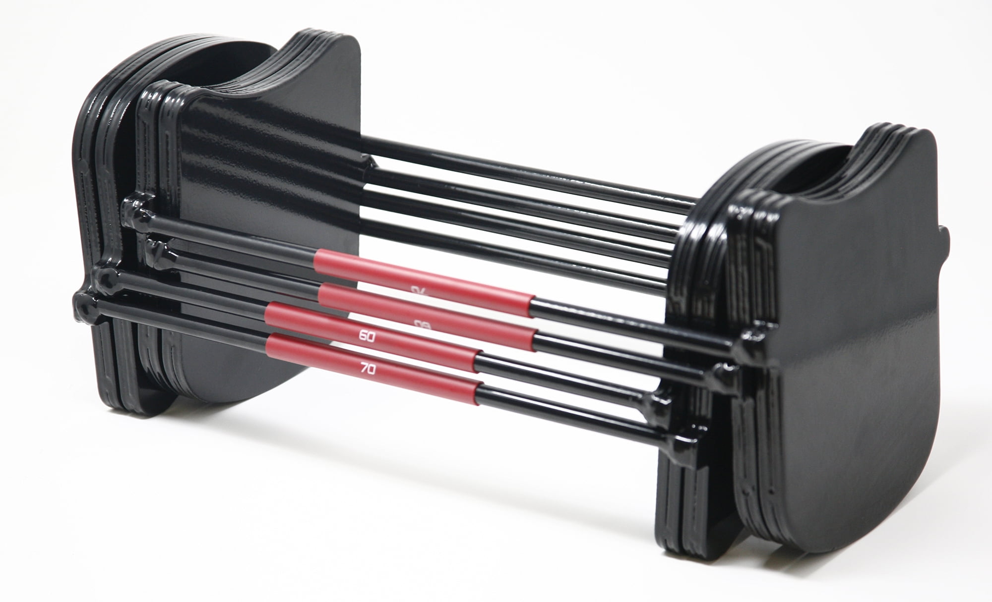 This solid and easy to use kit has a compact space-efficient design and the weight is printed on the rails for easy selections. Highly rated by customers. Get your Powerblock Dumbbells here.